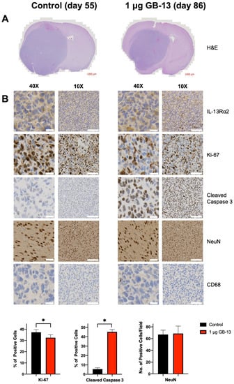 Immunohistochemistry of HGG-bearing mouse brains harvested when moribund. Presented samples were harvested on days 55 and 86 following CED of vehicle solution or GB-13 at a dose of 1 μg, respectively. Images are representative of four mice in each group. (A) Corresponding H&E demonstrates maintained tissue architecture and decreased tumor size after GB-13 treatment. (B) While IL-13Rα2 status is retained after a single CED infusion of GB-13, treatment leads to decreased cell proliferation (p = 0.03) and increases the number of apoptotic cells (p < 0.0001). The density of NeuN-positive neuronal (NeuN+) cells is retained in ipsilateral brain regions (p = 0.82). CD68+ monocyte infiltrate is not evidenced following GB-13 exposure. Scale bars: 40×: 20 μm, 10×: 100 μm.