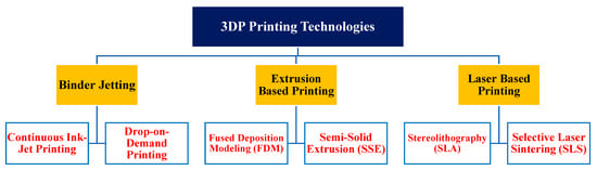 Inkjet-based, extrusion-based, and laser-based methods are the major 3DP methods employed in the pharmaceutical field. The methods, in turn, comprise different techniques among which binder jetting (BJ), fused deposition modeling (FDM), pressure-assisted microsyringes (PAM), stereolithography (SLA), and selective laser sintering (SLS) are the major ones. The 3DP technologies primarily differ in the various layers of material that are formed and assembled to produce the desired dosage form [] (Figure 3).