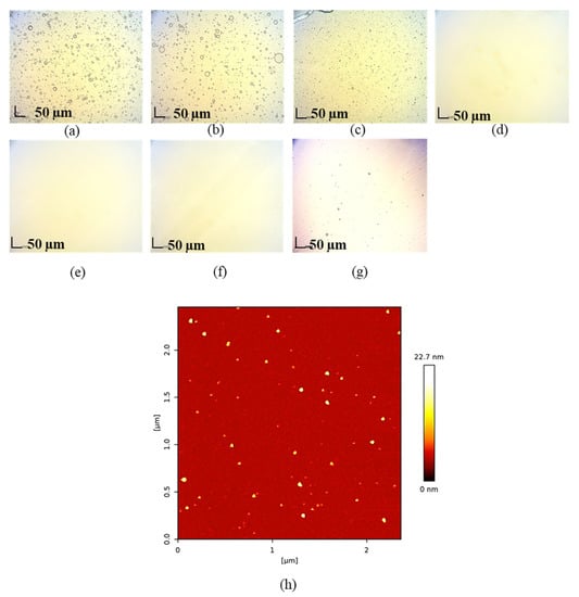 Microscopic images of AMO:VCO 0:100 (a), 30:70 (b), 50:50 (c), 70:30 (d), 80:20 (e), 90:10 (f), 100:0 (g) and the AFM image of AMO:VCO 80:20 (h).