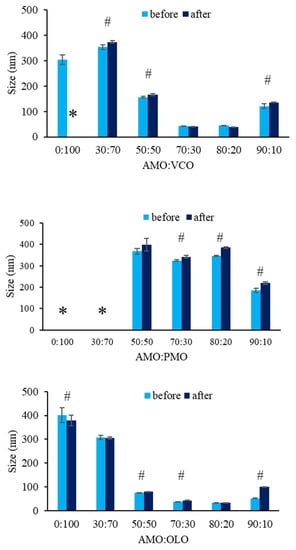Droplet size of the nanoemulsions prepared from different ratios of AMO:fixed oil and fixed oil type before and after the temperature cycling test, * indicates cracking and # indicates significant difference (p < 0.05). The values are expressed as mean ± SD (n = 3).