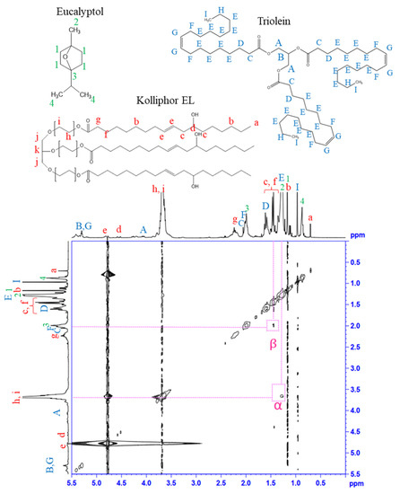The interaction among molecules was examined using 2D-NOESY NMR, which provides non-bonded proton interactions within 5 Å. As shown in Figure 4, the proton signal and chemical structures of OLO (triolein) and Kolliphor EL are assigned by capital and lowercase letters, respectively. Eucalyptol, the main component of AMO, is represented by a number. The 2D-NOESY spectrum showed the interaction among components as indicated by several cross-peaks. An interaction between the methyl proton from AMO (2) with polyoxyethylene from Kolliphor EL (h, i) and the alkyl chain proton from OLO (E) with polyoxyethylene from Kolliphor EL (h, i) were evident, as indicated by α. Moreover, a cross peak between Kolliphor EL (c, f) and OLO (C, F) was discovered (β). Likewise, the interaction among molecules was also found in the AMO:VCO 80:20 nanoemulsion (Supplementary Data S3). These interactions among the components may be a significant factor for determining the droplet size and stability of nanoemulsions. The AMO and OLO molecules interposed between the polyoxyethylene chains of Kolliphor EL and may increase the curvature of the surfactant, resulting in the creation of small droplets. In addition, the interaction of the components enhanced surfactant coverage at the oil droplet interface, thus increasing the stability of the nanoemulsion.