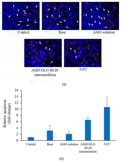Apoptosis is a preferable cell death type for anticancer agents because it is not associated with the inflammatory pathway [35]. To determine the type of cell death generated by the AMO nanoemulsions, nuclear fragmentation, exposure of phosphatidylserine on cell surface and related mRNA expression levels were examined by DAPI staining, annexin V-FITC/DAPI staining and qPCR, respectively. The AMO:OLO 80:20 nanoemulsion was selected as a representative nanoemulsion because it was the most effective against oral cancer cells compared with the other fixed oils and their solutions. An increase in apoptotic cells was observed following treatment with AMO:OLO 80:20 nanoemulsion, which were 6.57 ± 0.86 times greater compared with the control and comparable to 5-FU treatment. In addition, the nanoemulsion was more effective than the solution or base (Figure 6).