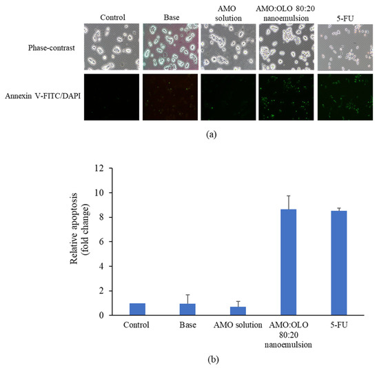 Phase-contrast and fluorescence (annexin V-FITC and DAPI staining) images of KON cells (a) and relative apoptosis (b) determined by annexin V-FITC/DAPI staining after induction with base (10% w/w of Kolliphor EL), AMO solution (at concentrations equivalent to that used in the nanoemulsions), AMO:OLO 80:20 nanoemulsion at an IC60 concentration, and 30 µg/mL of 5-FU. The values are expressed as mean ± SD (n = 3).