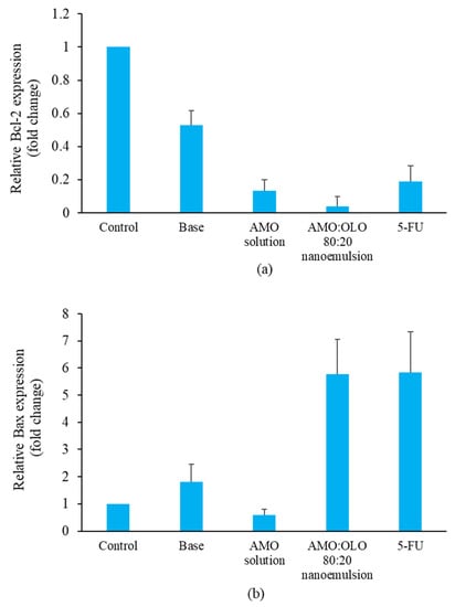 Relative Bcl-2 expression levels by qPCR (a) and relative Bax expression levels using qPCR (b) after induction with base (10% w/w of Kolliphor EL), AMO solution (at concentrations equivalent to that used in the nanoemulsions), AMO:OLO 80:20 nanoemulsion at an IC60 concentration and 30 µg/mL of 5-FU. The values are shown as mean ± SD (n = 3).
