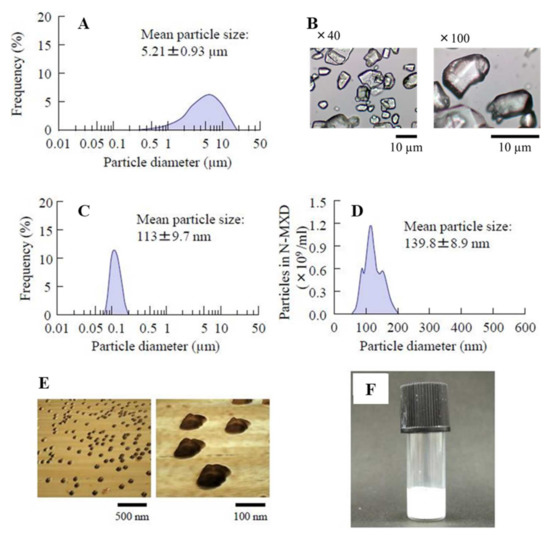 A dispersion containing MXD nanoparticles was prepared by referring to our previous reports [25,32,33]. MXD powder and MC were mixed and then milled using an agate mortar under cold conditions (4 °C) for 1.5 h, and the mixture (MXD, 5 g and MC, 8 g) was suspended in 100 mL of purified water containing methyl p-hydroxybenzoate (0.026%) and propyl p-hydroxybenzoate (0.014%) as preservatives); the dispersion was then stirred in 2-mL tubes with zirconia beads (diameter, 0.1 mm). After that, the mixture was milled by the combination of ultrasonic treatment for 5 min (W-113MK-II, Honda Electronics Co., Ltd., Aichi, Japan) and Micro Smash MS-100R at 5500 rpm for 30 s (TOMY DIGITAL BIOLOGY Co., Ltd., Tokyo, Japan). The ultrasonic and bead mill treatments were alternately repeated 30 times at 4 °C. Furthermore, the milled dispersion was crushed using a ShakeMaster® NEO (Bio Medical Science, Tokyo, Japan) with zirconia beads (diameter, 0.1 mm) for 120 min at 1500 rpm, and the obtained dispersions were used as MXD-NPs. Non-milled dispersions with the same composition (5% MXD, 8% MC, 0.026% methyl p-hydroxybenzoate and 0.014% propyl p-hydroxybenzoate in purified water, w/v %) were defined as MXD-MPs (control), and the pH of both MXD formulations was adjusted to 6.8. In the present study, MC was added to enhance the dispersibility of the MXD nanoparticles and to increase the crushing efficiency in the bead mill [25].