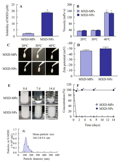Solubility, viscosity, zeta potential and dispersibility of MXD-MPs and MXD-NPs. (A) Solubility of MXD in MXD-MPs and MXD-NPs. (B) Viscosity of MXD-MPs and MXD-NPs. (C) Images of MXD-MPs and MXD-NPs at 20–40 °C. (D) Zeta potential of MXD-MPs and MXD-NPs, (E) and (F) Images (E) and dispersibility (F) of MXD-MPs and MXD-NPs. (G) Particle size distribution of MXD-NPs after the 14-d incubation. n = 7. * p < 0.05 vs. MXD-MPs. # p < 0.05 vs. MXD-MPs at 20 °C for each category. The solubility of the MXD-NPs was 8.76-fold that of the MXD-NPs, and over 99% of the MXD was solid MXD in the MXD-NPs. The viscosity was enhanced at 40 °C, and no aggregation was observed for 14 d in the MXD-NPs.