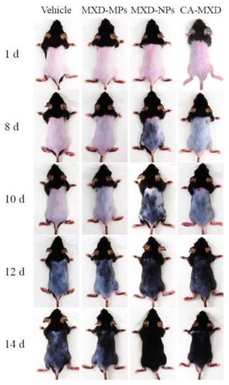Digital photos of C57BL/6 mice repetitively treated with MXD formulations (once a day). Vehicle, only the vehicle used to prepare the MXD-MPs and MXD-NPs formulations was applied. MXD-MPs, MXD-MPs-applied mice. MXD-NPs, MXD-NPs-applied mice. CA-MXD, CA-MXD-applied mice. The repetitive applications of MXD-NPs enhanced the hair growth, compared with repetitive applications of MXD-MPs or CA-MXD.