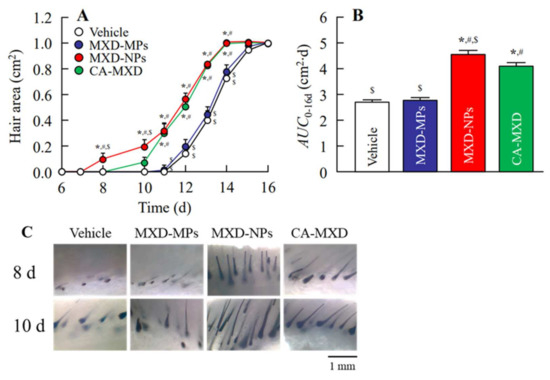 Effect of the repetitive application of MXD formulations on hair growth in C57BL/6 mice. (A) Changes in hair area and (B) AUC0–16d in C57BL/6 mice treated with repeated applications of MXD formulations (once a day). (C) Image of the skin cross-section of C57BL/6 mice skin after 8 d and 10 d of repeated applications of the MXD formulations (once a day). Vehicle, only the vehicle used to prepare the MXD-MPs and MXD-NPs formulations was applied. MXD-MPs, MXD-MPs-applied mice. MXD-NPs, MXD-NPs-applied mice. CA-MXD, CA-MXD-applied mice. n = 6–10. * p < 0.05 vs. Vehicle for each group. # p < 0.05 vs. MXD-MPs for each group. $ p < 0.05 vs. CA-MXD for each group. The AUC0–16d of the MXD-NPs-applied and CA-MXD-applied mice were significantly higher than that of the Vehicle and MXD-MPs groups. Moreover, hair growth started at 8 and 10 days after the initial treatment with MXD-NPs and CA-MCD, respectively, and hair-growth effects at 8–10 d after treatment were only observed in mice treated with MXD-NPs.