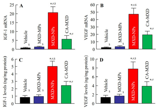 Effect of the MXD formulations (particle types and solution type) on IGF-1 and VEGF in the hair follicles of C57BL/6 mice at 8 d after the start of repetitive applications (once a day). (A) Expression of IGF-1 and (B) VEGF mRNA in C57BL/6 mice treated with MXD formulations. (C) IGF-1 and (D) VEGF levels in C57BL/6 mice treated with MXD formulations. The samples were prepared from the hair follicle (hair bulge and hair bulb region). Vehicle, only the vehicle used to prepare the MXD-MPs and MXD-NPs formulations was applied. MXD-MPs, MXD-MPs-applied mice. MXD-NPs, MXD-NPs-applied mice. CA-MXD, CA-MXD-applied mice. n = 5–9. * p < 0.05 vs. Vehicle for each category. # p < 0.05 vs. MXD-MPs for each group. $ p < 0.05 vs. CA-MXD for each group. The repeated treatment of MXD-NPs increased both the mRNA and protein levels of IGF-1 and VEGF, compared with those in the Vehicle, MXD-MPs and CA-MXD groups.