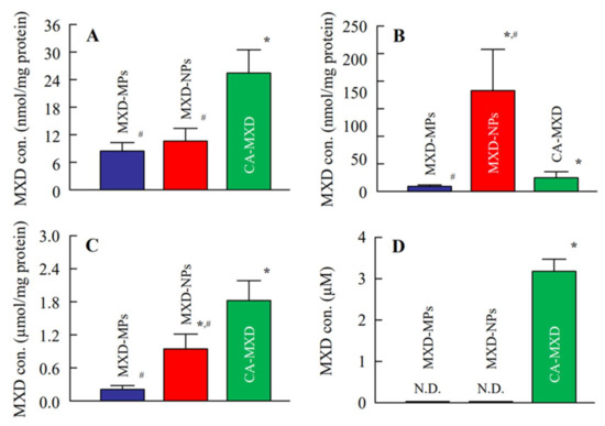 Soluble and dissoluble MXD in MXD formulations were separated by centrifugation at 100,000× g using a Beckman OptimaTM MAX-XP Ultracentrifuge (Beckman Coulter, Osaka, Japan), and the MXD levels in soluble and dissoluble MXD were analyzed using the HPLC method described as Section 2.4. The MXD formulations were incubated for 2 weeks at 22 °C to evaluate their dispersibility, and samples were taken from 5 mm under the surface over time. The MXD concentrations in the samples were measured using the HPLC method described above. The particle size of MXD-MPs in the range of 0.01–50 µm was measured using the SALD-7100 (Shimadzu Corp., Kyoto, Japan) and the Motic BA210E (Shimazu Corp., Kyoto, Japan), and the particle size of MXD-NPs in the range of 0.01–50 µm and 0–600 nm were measured using the SALD-7100 and the NANOSIGHT LM10 (Quantum Design Japan, Tokyo, Japan), respectively. The refractive index in the SALD-7100 was set at 1.60–0.010 i, and the measurement conditions for the NANOSIGHT LM10 were a viscosity of 1.45 mPa∙s, a wavelength of 405 nm, and a measurement time of 60 s. Additionally, the number of nanoparticles was also measured using the NANOSIGHT LM10. The SPM-9700 was used to obtain an atomic force microscopy (AFM) image of the MXD-NPs (Shimadzu Corp., Kyoto, Japan), and the zeta potential was analyzed using a Zeta Potential Meter Model 502 (Nihon Rufuto Co., Ltd., Tokyo, Japan). The viscosities of the MXD formulations were measured using a Brookfield digital viscometer at 20–40 °C (Brookfield Engineering Laboratories, Inc., Middleboro, MA, USA).