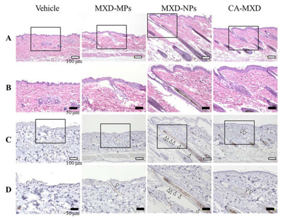 Microscopic effects of MXD formulations on skin tissue (hair bulge and hair bulb) of C57BL/6 mice at 8 d after the start of repetitive applications (once a day). (A) Images of H&E-stained skin tissue specimens from C57BL/6 mice (bars indicate 100 µm). (B) High magnification microscope images in the areas designated by the squares in Figure A (bars indicate 50 µm). (C) Optical images of immunostaining for CD200 in the serial segments shown in Figure A (bars indicate 100 µm). (D) High magnification microscope images of the areas designated by the squares in Figure C (bars indicate 50 µm). Vehicle, only the vehicle used to prepare the MXD-MPs and MXD-NPs formulations was applied. MXD-MPs, MXD-MPs-applied mice. MXD-NPs, MXD-NPs-applied mice. CA-MXD, CA-MXD-applied mice. The arrow shows the expression of CD200. CD200 is stained brown; the expression of CD200 was enhanced in the MXD-NPs group, compared with the CA-MXD group.