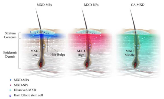Schemes for drug delivery into the hair bulge and bulb region for MXD-MPs (powder type), MXD-MPs (NPs type) and CA-MXD (solution type) formulations.
