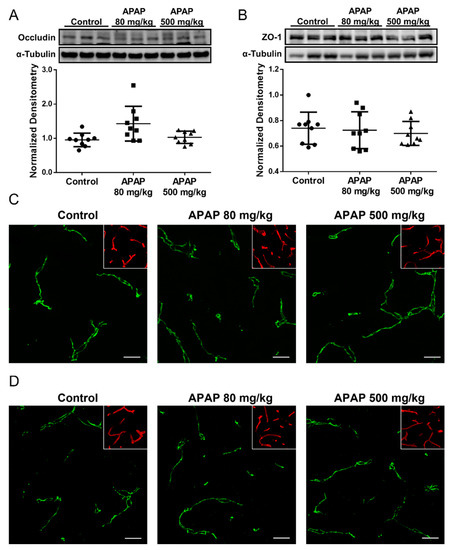 Three hours after treatment with vehicle or APAP, rats were anesthetized with ketamine/xylazine and decapitated. The brain was immediately removed and snap-frozen at −75 °C in isopentane on dry ice. Cryosections (20 μm) were mounted onto glass slides and stored at −80 °C until needed for staining. Sections were fixed in methanol at −20 °C, blocked in PBS with 0.3% Triton X-100 + 5% goat serum and then incubated in primary antibody overnight at 4 °C. Primary antibodies used for immunofluorescence were rabbit anti-ZO-1 (Cat #40-2200; 1:750 dilution; Thermo Fisher Scientific, Waltham, MA, USA), mouse anti-claudin-5 (Cat #35-2500; 1:500 dilution; Thermo Fisher Scientific, Waltham, MA, USA), and mouse anti-occludin (OC-3F10; Cat #33-1500; 0.5 mg/mL; 1:500 dilution; Thermo Fisher Scientific, Waltham, MA, USA). These antibodies were detected with Alexa 488 goat anti-rabbit (Cat #A11008; 1:500 dilution; Thermo Fisher Scientific, Waltham, MA, USA) and Alexa 568 goat anti-mouse (Cat #A11004; 1:500 dilution; Thermo Fisher Scientific, Waltham, MA, USA). DyLight 649-tomato lectin (Cat #DL-1178-1; Vector Laboratories, Burlingame, CA, USA) was used to label and visualize the cerebral vasculature. Control experiments were conducted by incubating sections in the presence of secondary antibody only (i.e., no primary antibody controls). Data for these control experiments are presented in Figure S1B.