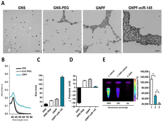 Physicochemical characterization of the gold nanosystems. (A) Representative TEM micrographs for each step of the functionalization process. The spherical morphology of gold nanoparticles with an average size of 12 nm can be observed. The scale bar represents 100 nm. (B) Molecular absorption spectrophotometry of the nanosystems, showing the absorption bands that correlated to the plasmon resonance effect in the gold nanospheres. (C) Characterization of the hydrodynamic diameter in each step of the functionalization. It is possible to appreciate the increment in the size as other molecules coated on the nanoparticle surface. (D) ƺ potential determinations evaluated in each functionalization. Changes in magnitude occurred when molecules with opposite charge were conjugated. (E) Fluorescence image (left) and its quantification (right) of the GNPF functionalized with the miR145 coupled to the Cy5 fluorophore. It can be visualized that the miR-145 fluorescence is quenched when it is present on the nanoparticle surface. 1 = miR145; 2 = GNPF-miR145; 3 = GNPF; ** = p < 0.001.