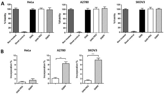 The nanosystems were incubated with HeLa (uterine), A2780 (ovarian), and SKOV3 (ovarian) cultured cell lines to assess the viability and cell interaction effects. The results showed that neither the incomplete nanosystems (GNS or GNS-PEG) nor GNPF provoked a deleterious effect on viability in the three mentioned cell lines (Figure 2A). In addition, the presence of GNPF inside the cells was significantly higher in the ovarian cancer cell lines (that overexpress the FSH receptor [12]) compared with the uterine cell line, and it was superior to GNS-PEG, having a positive charge (Figure 2B). The results indicate that GNPF does not evoke a negative viability response and can reach and selectively interact with ovarian cancer cells, probably due to the conjugation with the FSH33 ligand, whose receptor is only present in ovarian cells and upregulated in ovarian cancer cells.