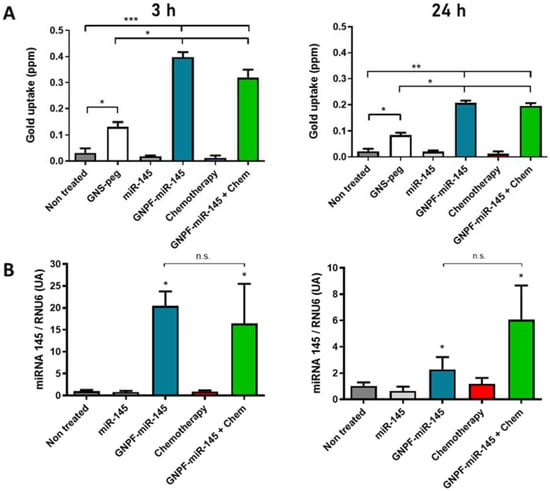 Quantification of cellular incorporation of GNPF-miR-145. (A) Gold quantification in A2780 cells at 3 and 24 h. The data were obtained in triplicate; n = 3; error bars = standard deviation. (B) miR-145 quantification. Normalized miR-145 levels in cells treated with free miR-145, GNPF-miR-145, chemotherapy and GNPF-miR-145 + chemotherapy, evaluated at 3 and 24 h (left and right graphs, respectively). * = p < 0.05, ** = p < 0.01 and *** = p < 0.001 with respect to the miR-145 control; n.s. = statistically not significant; n = 4; error bars = standard deviation.