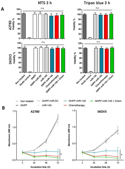 Cell viability and proliferation after incubation with the final nanosystems. (A) MTS viability and trypan blue exclusion assays in A2780 and SKOV3 cell lines after 3 h incubation with 1 nM of GNPF, GNPF-SC-miR, miR-145, GNPF-miR-145, chemotherapy, and GNPF-miR-145 + chemotherapy. n = 3, n.s. = not significant. (B) Proliferation assay using MTS reaction at 3, 24, 48, and 72 h exposure to the nanosystems. For all graphics, error bars represent the standard deviation, * = p < 0.05.
