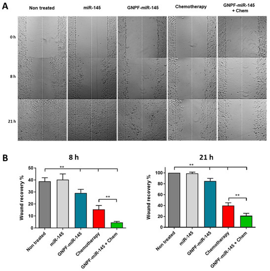 Cell migration assays were performed for the SKOV3 cell line using the wound healing method. With this in mind, from an initial cell culture of 70% confluence, 50,000 cells were seeded per well in 96-well plates with DMEM/10% SFB medium for 24 h. On the second day, a 100% confluence was verified, the culture medium was removed, washed with sterile PBS, exchanged for DMEM/1% SFB medium, and the cells were treated with: GNPF, miR-145, GNPF-miR-145, chemotherapy, and GNPF-miR-145 + chemotherapy, incubating for 24 h. On the third day, changes in the cell monolayer were verified by visual inspection, and a vertical wound was made with a sterile 200 µL tip in each well, using the lid of the 96-well plate as a guide. The culture medium was then removed, the cells were washed with sterile PBS to remove cells and debris that were released after wound formation, and the medium was renewed with DMEM/10% SFB. Images of the wound formed in each well were captured at 0, 8, and 21 h on an Olympus U-CMAD3 inverted light microscope, using a Nikon DS-F12 camera. Subsequently, the images were analyzed using the ImageJ software, measuring the distance between the borders of both sides of the wound at each time, for each well, taking as reference the same image at time 0 of each well as 100% opening (0% recovery). Data were obtained in triplicate with n = 4.