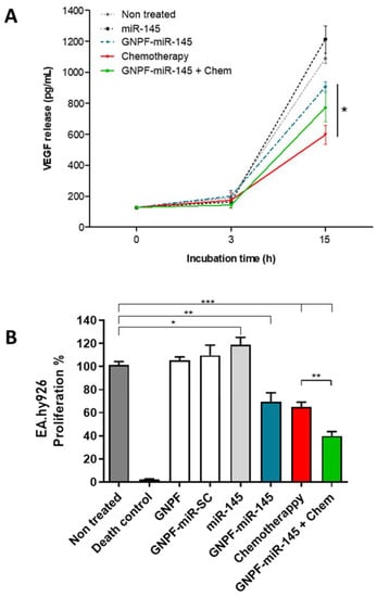 To evaluate the effect of GNPF-miR-145 on VEGF release into the medium, an ELISA immunoassay was performed on culture media obtained from A2780 cells incubated with GNPF-miR-145 for 0, 3, and 15 h, and the effect over proliferation of EA.hy926, an endothelial cell line, was evaluated. The results indicated that at 3 h of incubation, no significant differences in the release of VEGF between the treatments were found. However, at 15 h of incubation, the culture media from cells treated with GNPF-miR-145, chemotherapy, and GNPF-miR-145 + chemotherapy showed significantly lower VEGF levels than free miR-145 and controls without treatment. GNPF-miR-145 treatment resulted in 25% less VEGF release compared to free miR-145-treated control. Meanwhile, GNPF-miR-145 + chemotherapy decreased VEGF release by 36%, and chemotherapy by 45% (Figure 6A). This effect was obtained between 3 and 15 h incubation, which correlated with the nanosystem internalization times obtained.