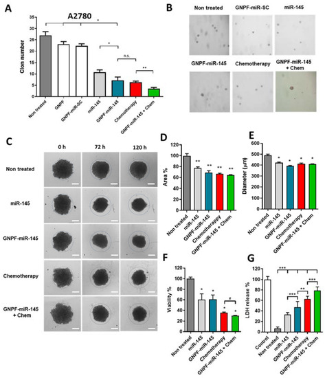 The clonogenic capacity of the A2780 cell line was assessed. For this, a growth curve of tumoroids was first calculated with increasing cell concentrations, determining the optimal number of cells to be seeded to obtain quantifiable tumoroids. A total of 7000 cells were seeded per well in 6-well plates in soft agar, in triplicate, with the following treatments: DMEM/SFB 10% medium (control), GNPF, GNPF-SC-miR 1 nM, miR-145 25 nM, GNPF-miR-145 1 nM, chemotherapy (8 µM paclitaxel + 50 µM carboplatin) and GNPF-miR-145 + chemotherapy (1 nM GNPF-miR-145 + 8 µM paclitaxel + 50 µM carboplatin). Cells were incubated for 14 days, and clones with diameters of 100 µm formed under each treatment were counted by light microscopy.