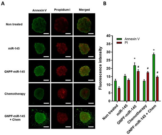 Annexin V and propidium iodide apoptosis assay in the treated spheroids. (A) Representative fluorescence images of the spheroids after 120 h of treatments, incubated with annexin V and propidium iodide. Scale bar = 200 µm (B) Fluorescence quantification of the images. Data were obtained in duplicate, n = 3. For all graphics, error bars represent the standard deviation; * = p < 0.05 relative to the annexin V untreated control, # = p < 0.05 relative to the propidium iodide untreated control.