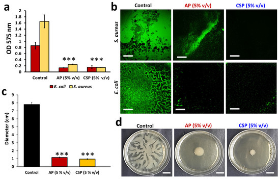 We initiated this investigation with a hypothesis that certain constituents of cell-free supernatants derived from the probiotic L. plantarum could provide promising antagonistic activities against pathogenic microorganisms. First, we assessed the effect of differentially collected postbiotics (AP or CSP, as described in Section 2.2) against two bacterial pathogens, namely E. coli and S. aureus. The tested postbiotics did not show any significant bactericidal effect on the tested pathogens at the tested dosage (Figure S1). However, we noted a drastic decline in the biofilm-forming ability of the pathogen when grown in the presence of either AP or CSP (Figure 1a). Both postbiotics (AP or CSP) showed a similar effect, indicating that cold stress does not improve notably the antagonistic activities. Further, we confirmed the inhibition of biofilm surface area on a polystyrene substrate by fluorescent microscopic analysis (Figure 1b). The results pinpoint that the tested postbiotics might contain putative signals (metabolites) that disarm biofilms without compromising the planktonic cells. Such molecules could be a prerequisite to the antibiofilm drug discovery.