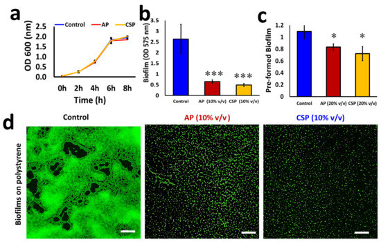 Effect of AP and CSP on growth, biofilms and pre-formed biofilms of Candida albicans. (a) Growth profile of C. albicans in the presence and absence of AP or CSP (10% v/v). (b) Crystal violet quantifications of C. albicans biofilm formation on polystyrene surface in the presence and absence of AP or CSP (10% v/v). The graph shows the means ± SEMs of three measurements. *** p < 0.001 vs. the non-treated controls. (c) Effect of AP or CSP (20% v/v) on pre-formed mature biofilms of C. albicans. The graph shows the means ± SEMs of three measurements. * p < 0.05 vs. the non-treated controls. (d) Fluorescent microscopic images of C. albicans biofilms on polystyrene surfaces treated with AP or CSP (10% v/v). The microtiter plates containing 24 h C. albicans biofilms were stained with SYTO™ 9. Scale bar: 100 µm.