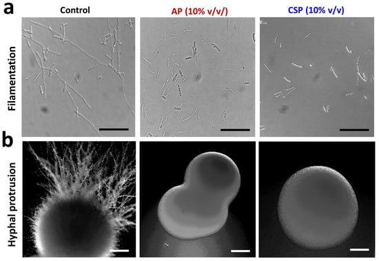 Microscopic images of Candida albicans colonies and hyphal filaments. (a) Effect of AP or CSP (10% v/v) on yeast-to-hyphal transition (filamentaion) in C. albicans grown in liquid RPMI-1640 media. Scale bar: 20 µm. (b) Effect of AP or CSP (10% v/v) on hyphal protrusion from colony edges of C. albicans grown on potato dextrose agar (PDA). The plates containing colonies were incubated for 7 days at 37 °C. Scale bar: 200 µm.