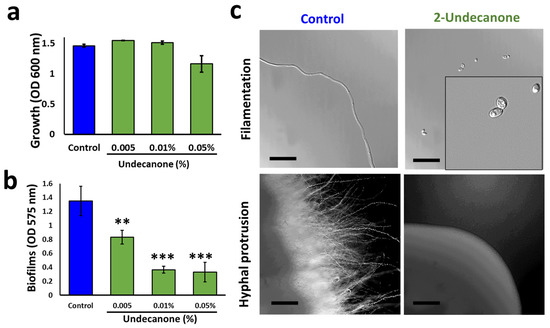 Effect of 2-undecanone on Candida albicans physiology. (a) Growth profile of C. albicans in the presence and absence of 2-undecanone in potato dextrose broth (PDB). (b) Crystal violet quantifications of C. albicans biofilm formation on polystyrene surface in the presence or absence of 2-undecanone in PDB. The graph shows the means ± SEMs of three measurements. *** p < 0.001 and ** p < 0.01 vs. the non-treated controls. (c) Effect of AP or CSP (10% v/v) on yeast-to-hyphal transition (filamentations), and hyphal protrusion from colony edges in C. albicans grown in liquid RPMI-1640 media and PDA agar, respectively. Scale bar: 200 µm.