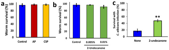 Assessment of toxicity profile of AP, CSP and 2-undeconone in a Caenorhabditis elegans model. (a) Effect of AP or CSP (10% v/v) on C. elegans survival. The graph shows the means ± SEMs of three measurements. (b) Effect of 2-undecanone (10% v/v) on C. elegans survival. The graph shows the means ± SEMs of three measurements. (c) Effects of 2-undecanone (0.01%) on survival of C. elegans exposed to C. albicans for a period of seven days. ** p < 0.01 vs. the non-treated controls.