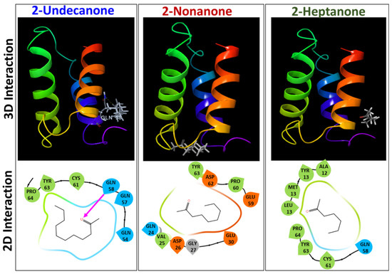 Molecular interaction of ketones with hyphal wall protein 1 (Hwp1 protein). The 3D and 2D interaction diagram showing interactions between ligands (2-undecanone, 2-nonanone, and 2-heptanone) with the active sites of hyphal wall protein 1 (Hwp1). Pink arrow represents the H-bonds.