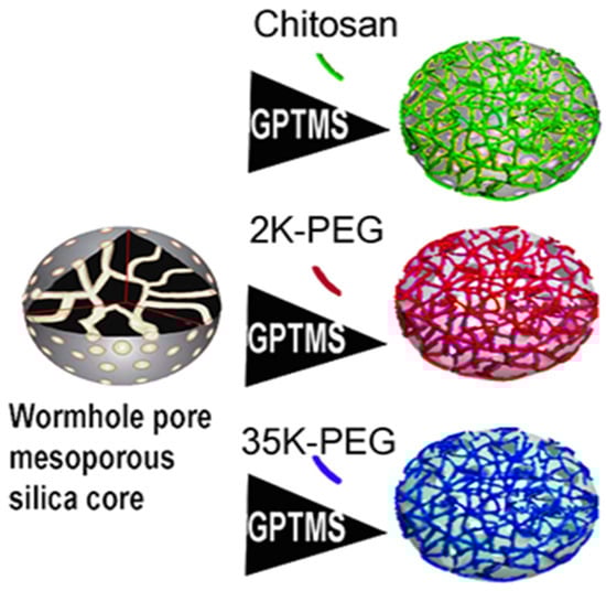 Schematic illustration of preparation of coated MSN preparation. Following synthesis of base MSNs, GPTMS linker is attached for subsequent chitosan, 2KPEG, or 35KPEG conjugation.