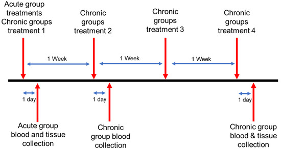 Timing schematic of in vivo toxicity studies. Acute and chronic group treatments began concurrently. Blood collections were held 24 h following select treatments. Tissue collections were held 24 h following the final treatment for respective treatment groups.