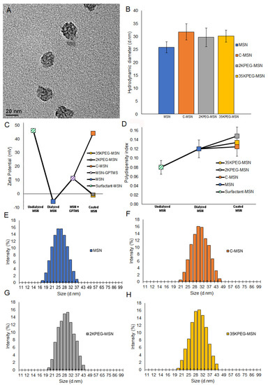 MSNs were prepared through modified Stober synthesis. An emulsion of surfactant scaffold was formed under high temperature. Silica precursor coats the scaffold to create uniform MSNs of approximately 25 nm, measured with dynamic light scattering (DLS). While many sized MSNs are utilized, 25 nm has been identified as an intriguing size; large enough to avoid rapid glomerular filtration, but small enough to avoid sequestration by Kupffer cells in the liver [36]. Following preparation, MSNs are dialyzed to remove surfactant, preventing the possibility for surfactant-based toxicity. Prior to conjugation of coatings, nitrogen adsorption/desorption isotherms were analyzed with BET/BJH methodology to estimate MSN pore volume of 0.23 cm3/g, and MSN specific surface area of 750 m. Chitosan solution (1% weight by volume) was prepared in acetic acid and water. Due to controversy in toxicity as a result of PEG, PEG solutions with different molecular weights were utilized. PEG2000 and PEG35000 were selected due to a tradeoff between rapid clearance and extended circulation time that is relevant to drug delivery [37]. About 2% weight by volume solutions were prepared in water for molecular weights of 2000 (PEG2000) and 35,000 (PEG35000). Following surfactant removal, MSNs were diluted in ethanol and functionalized using an organosilane-epoxy linker for external coating attachment. PEG2000, PEG35000, and chitosan solutions were added to the MSN solution for attachment of coating. Average diameters were as follows: MSNs-25.8 (±2.1) nm; C-MSNs-31.8 (±3.1) nm; 2KPEG-MSNs-29.7 (±3.6) nm; and 35KPEG-MSNs-30.1 (±2.3) nm (Figure 3A,B). Full size distributions are included (Figure 3E–H). All polydispersity indexes were around or below 0.15, indicating monodisperse samples (Figure 3D). After synthesis, surfactant surrounding MSNs result in zeta potential measurements of 46 mV, which is reduced to −5.6 mV after surfactant removal, and increased to 11.3 mV following GPTMS addition (Figure 3C). Conjugation of chitosan was confirmed through increased zeta potential (44.1 mV) due to amine functional groups in physiological pH (7.4) [27,29]. Similarly, zeta potential for 2KPEG-MSNs (−0.6 mV) and 35KPEG-MSNs (−0.9 mV) increased slightly due to coating of silanol groups and decreasing external hydroxyl groups on MSNs, but not as dramatically as C-MSNs due to lack of amine functionality [38].