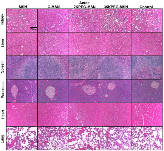 H&E-stained organs from acute treatment groups (MSNs, C-MSNs, 2KPEG-MSNs, 35KPEG-MSNs). Images were acquired at 10× magnification.