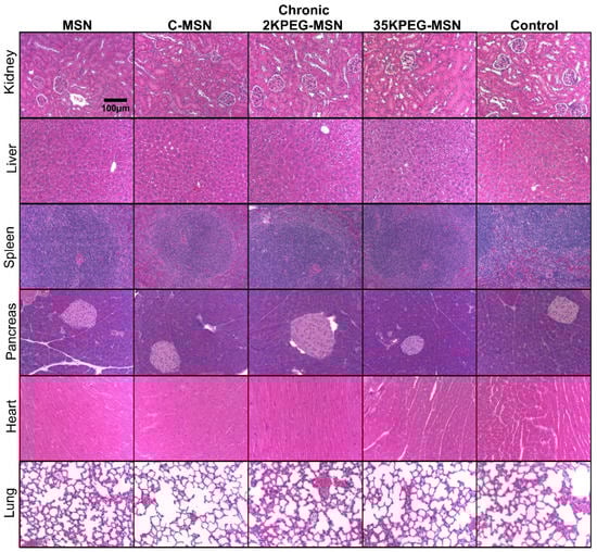 H&E-stained organs from chronic treatment groups (MSNs, C-MSNs, 2KPEG-MSNs, 35KPEG-MSNs). Images were acquired at 10× magnification.