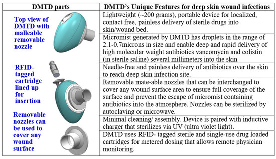 Droplette micromist technology [21] developed and patented (US 9,700,686 B2 and PCT/US2016/035695) by Droplette Inc. is a needle-free and painless transdermal delivery device. Droplette is the first device to combine a piezoelectric transducer and pneumatic diaphragm pump to provide delivery of large molecules deep into skin and soft tissue. The transducer cavitates the fluid to form uniform and monodisperse droplets ejected in a transitional-turbulent flow regime. The diaphragm pump then introduces force at an angle perpendicular to the flow, which reduces shear force on the droplets and accelerates their velocity, preventing coalescence of the droplets and inducing their break into even smaller sub-micron droplets that are capable of penetrating skin with high speed. We have been working with Droplette Inc. to develop a custom device called Droplette micromist technology device (DMTD) to treat deep skin infections. DMTD is fitted with a series of removable and mate-able nozzles of varying widths that can be interchanged to fully cover the wound surface area (open or closed wounds). These adjustable nozzles allow us to cover the surface area of the wound to allow rapid focused delivery of the micromist carrying antibiotics to the top of skin infection site to reach several millimeters deep into the skin. The unique characteristics of DMTD that makes it highly suited for treatment of wounds and deep skin infections are listed in Figure 1.