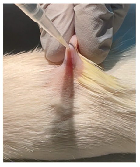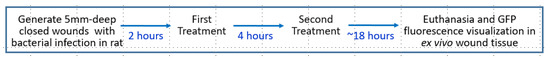 Briefly, rats were anesthetized using isoflurane, and a 1 cm2 area of skin on the back was shaved and prepped with alcohol. Three deep but narrow wounds (5 mm deep) were generated on each rat’s back using an 18-gauge needle. Next, 30 µL of GFP-E. coli (2.3 × 109 cells) was slowly dispelled into the narrow wound by pulling the skin upward and using a micropipette (Figure 2). Care was taken to ensure that all of the inoculum was dispelled into the wound.
