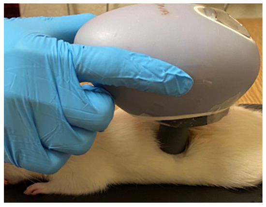 Representative image showing the placement of the nozzle of DMTD on top of the skin surrounding the infection site for delivery of CMS onto the third infected wound on a rat’s back.