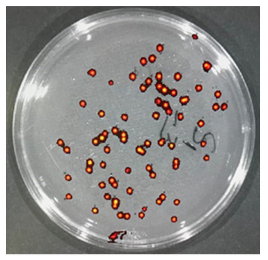 Representative image of LB agar-Amp plate on which a serial dilution of the bacteria from the skin tissue extract of a saline-treated wound was plated. All colonies exhibited robust GFP fluorescence, false colored yellow and red, when visualized using IVIS Spectrum CT Biophotonic Imager (excitation wavelength of 500 nm, emission wavelength of 540 nm, 2 s exposure time).