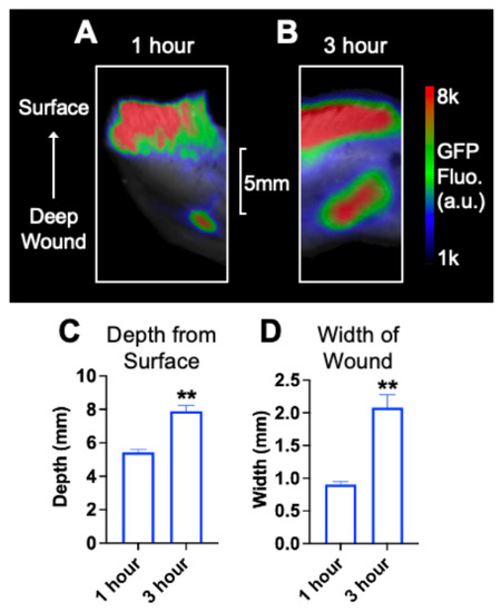 Figure 6A,B show representative images the GFP fluorescence (509 nm) generated by GFP-E. coli in deep skin wounds of female Wistar rats after 1 h and 3 h of initiating infection. The infection was initiated by placing 2.3 × 109 GFP-E. coli cells. The average depth (Figure 6C) and width (Figure 6D) of GFP fluorescence was 5.4 ± 0.3 mm and 0.9 ± 0.1 mm, respectively, after one hour.