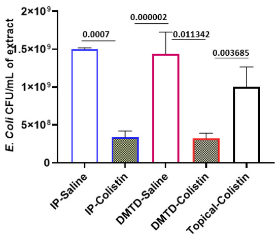 Total number of CFUs present in the 5 mL of tissue extracts of infected deep skin wounds that were treated with IP-delivered saline (IP-saline) or colistin (IP-colistin), DMTD-delivered saline (DMTD-saline) or colistin (DMTD-colistin) and topical application of equal dose of colistin (Topical colistin). The actual p values are shown on top of the bars.
