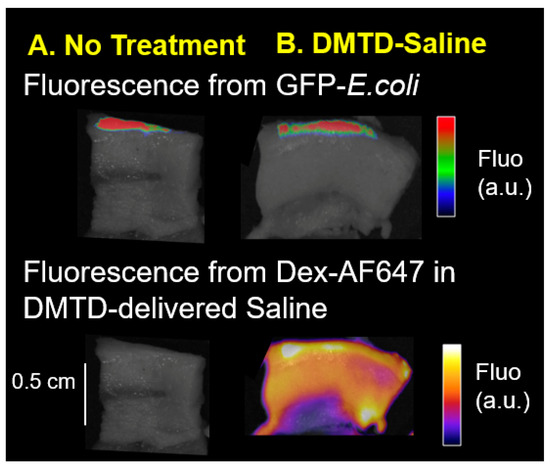 Since DMTD-delivered micromist can reach several millimeters deep into the skin, an important concern is if DMTD-delivered micromist will cause deeper penetration of microbes present on the wound surface causing deeper penetration of infection. Therefore, we determined if DMTD-delivered saline caused deeper penetration of bacteria present on the surface of a wound using ex vivo Yorkshire pig skin that is anatomically similar to human skin [23,24,25] and GFP-E. coli to easily track the depth of penetration of the bacteria. We generated open shallow wounds (0.5 mm deep 9 mm2 surface area) on ex vivo pig skin and infected them with 2 × 107 GFP-E. coli cells as described in Section 2. After 45 min (allowing bacteria to attach), images of wounds were taken to visualize GFP fluorescence using IVIS Spectrum CT Biophotonic Imager, Perkin Elmer, Waltham, MA, USA. GFP fluorescence was visible at the wound surface (Figure 9A: No Treatment). Then, a subset of wounds (n = 3) were subjected to a 1 min DMTD delivery of 600 µL of saline containing DEX-AF-647 to track the depth of delivery. However, DMTD delivery of saline did not increase the depth of GFP fluorescence (from GFP-E. coli) indicating that 1 min DMTD delivery of saline micromist did not result in deeper penetration of GFP-E. coli into the skin. The fluorescence from DEX-AF-647 present in the DMTD-delivered saline reached a depth of ~5 mm into the pig skin (Figure 9B) indicating that the micromist delivered by DMTD reached deep skin tissue as expected.