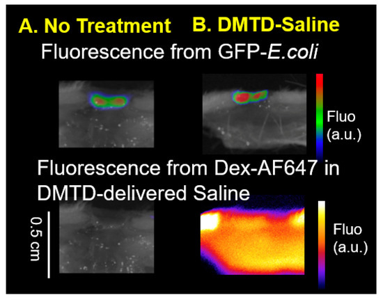 Representative images of rat skin wounds infected with GFP-E. coli. The depth of GFP fluorescence was similar in untreated wounds (A) and wounds treated with 1 min delivery of 600 µL of DMTD-delivered saline containing the fluorochrome DEX-AF-647 (B). n = 3 for all groups. DEX-AF-647 in the DMTD-delivered saline reached 5 mm depth in the skin indicating that the DMTD delivery was successful. a.u. Arbitrary Units; Fluo: Fluorescence.