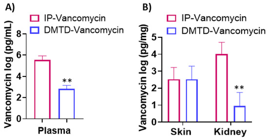 Vancomycin levels in (A) Plasma and (B) skin and kidney when the drug was delivered by either systemic IP or localized DMTD delivery to mice. n = 3. ** p < 0.01.