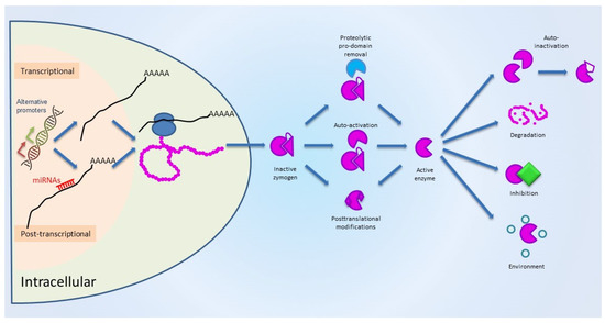 Proteases are regulated at multiple levels that include: (i) the transcriptional, (ii) the post-transcriptional (miRNAs, alternative polyadenylation, etc.), and (iii) the post-translational level, i.e., proteases are synthesized as pro-enzymes that require activation. The activity of mature enzymes is further regulated by complexation with endogenous inhibitors, degradation, pH changes, and chemical modifications (e.g., phosphorylation) that affect their activity [3] (Figure 1).