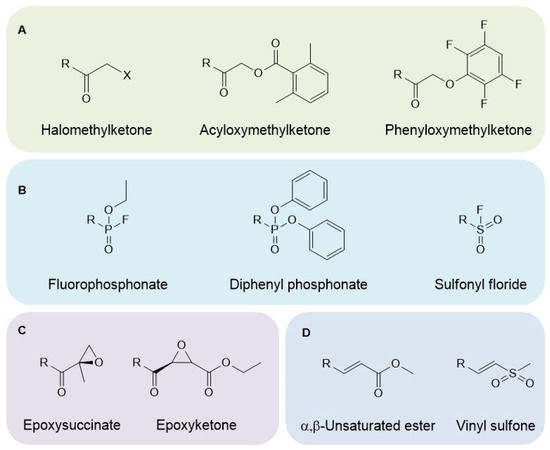 Chemical formulas of warheads used to target proteases. Phosphonates are the classical warheads for targeting serine proteases and acyloxymethyl ketones for cysteine proteases. (A), activated ketones. (B), phosphonates. (C), epoxides. (D), Michael acceptors.