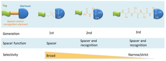 Transition from first to third generation phosphonate ABPs. Incorporation of a longer recognition element in the ABP molecule results in improved specificity. Notably, first generation phosphonate ABPs target hydrolases including proteases.