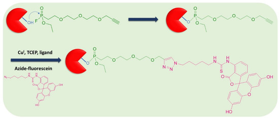 In this approach, the ABP is comprised of two parts, one that contains the reactive group including the spacer and the recognition sequence, if required, and the other is the tag. The reactive group reacts with the target protease, then, the tag forms the adduct for enzyme labeling. Biorthogonal click chemistry based on the 1-alkyne and azide moieties is applied to promote the reaction between the tag and the warhead-protease adduct. The principle of click chemistry-based labeling of active serine hydrolases is depicted in Figure 5. This assay was tested with active kallikrein-related peptidase 7 (KLK7) [19]. The advantage of click chemistry-based ABPs lies in the fact that molecules are smaller in size and exhibit enhanced cell permeability, therefore, more suitable for in vivo applications, such as in vivo imaging. For preclinical in vivo imaging, copper-free click chemistry will offer a great potential, since it does not require the addition of catalysts. Copper-free click chemistry takes advantage of the smallest stable cycloalkynes, the cyclooctynes. The reaction between the azide and the cyclooctyne is biocompatible, and simpler than the reaction between the azide and the 1-alkyne, because the [3+2] cycloaddition occurs in the absence of catalysts [20].