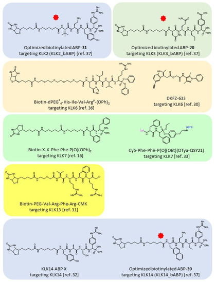 Despite their important roles in (patho)physiology, attempts to generate ABPs targeting specific KLKs, that could be used to determine the active forms of these enzymes, were described only very recently. In fact, the first ABP to target KLKs was the compound DKFZ-633 that is specific for KLK6 and was based on a depsipeptide inhibitor of KLK6 that was modified to carry a 1-alkyne moiety, thus, detection was achieved with a click chemistry-based approach [30]. Then, a KLK13 specific ABP was developed (Figure 6), which contained the KLK13 specific tetrapeptide (Val-Arg-Phe-Arg) substrate modified with a chloromethyl ketone warhead and a biotin tag [31], and a KLK14 specific phosphonate tetrapeptide ABP [32]. Nonetheless, in all these cases, the ABPs were not used for therapeutic purposes.